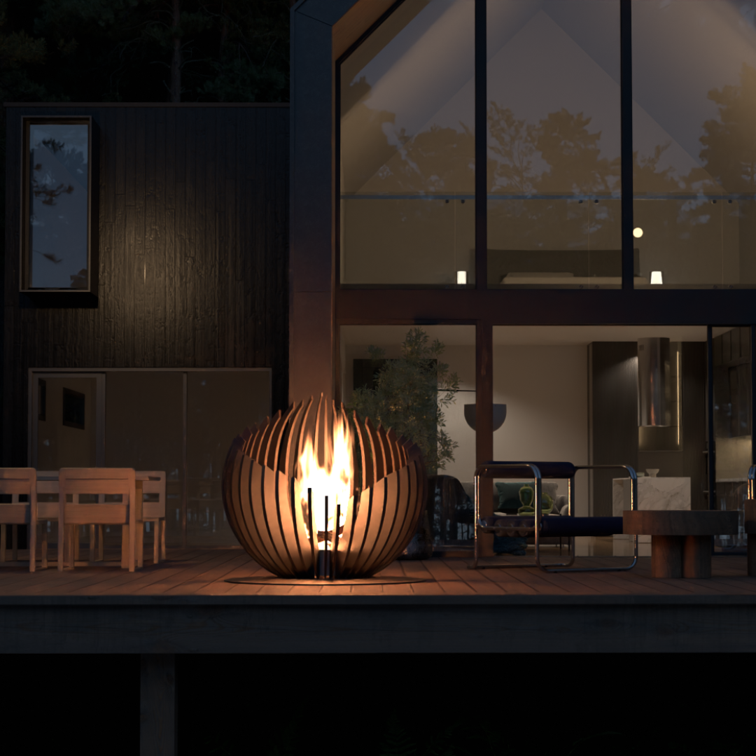 Vores rejse begyndte med ønsket om at forene design og natur. Vi ville skabe skulpturelle elementer, der ikke blot kunne modstå vind og vejr – men som kunne løfte enhver udendørs oplevelse. Vores produkter er fremstillet i cortenstål, et materiale der ældes med ynde og bliver smukkere for hvert år. Det er design, der indbyder til nærvær, samtale og varme – midt i det fri.